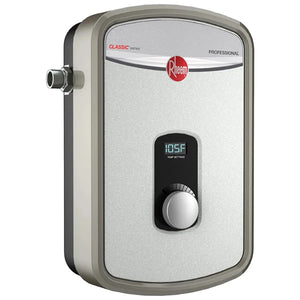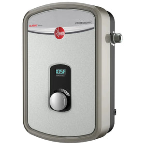 Rheem RTEX-13 Professional Classic Series 13 KW, 240 Volt, 54 Amps, 4.8 Gallon Per Minute Indoor Electric On Demand Tankless Hot Water Heater Professional Classic® Energy efficient tankless electric indoor inline water heaters offer continuous/endless hot water quickly and on demand for single point-of-use such as sinks, showers or bathroom or multiple applications. These compact tankless residential electric water hot heaters are also great RVs, campers, mobile homes and travel trailers. Rheem's compact low profile design allow these small, yet highly powerful, eco friendly and money saving 4.8 gallon per minute point of use tankless water heaters to fit easily under kitchen and bathroom sinks and counters.